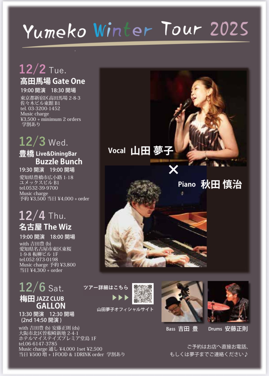 多種多様なレコーディングを手掛けてきたピアニスト、作曲家、編曲家の秋田慎治によるアレンジでピアノデュオでの珠玉のバラードから躍動感溢れるバンドサウンドまで、その中で常に真っ直ぐに心の奥まで染み渡る山田夢子の深い声色、表現は必聴、次世代を担う令和の正統派ジャズボーカリストにご期待ください!!
