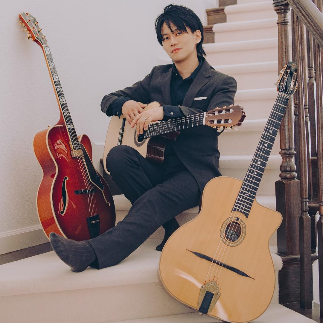 フォークギター、フルアコースティックギター、マカフェリギターと様々なギターを使い分け演奏する。